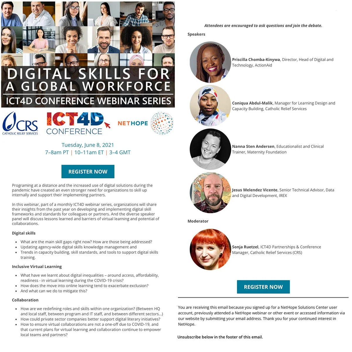 I gave each webinar its own landing page. I was able to leverage that cyber real-estate as a point of connection between my audience, my co-presenting partner organizations, SMEs, etc. And it became a perennial home for resources like the embedded webinar recording, downloads, discounts, and useful links to resources outside of the NetHope environment.